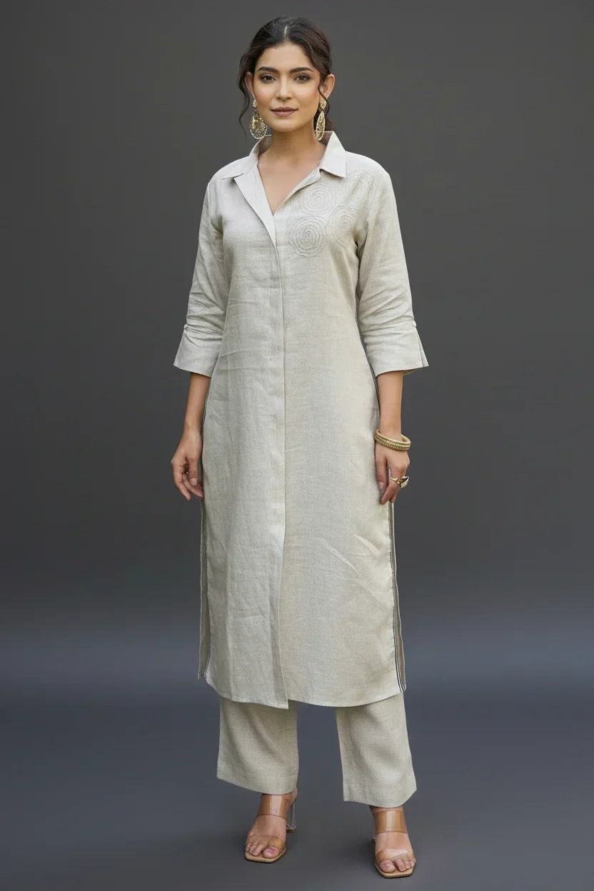 Redefine minimalism with our Stone Beige Coord Set, a refined ensemble that speaks volumes with its clean lines and effortless grace. Ideal for workdays or intimate gatherings, it’s a wardrobe essential for those who appreciate quiet sophistication.