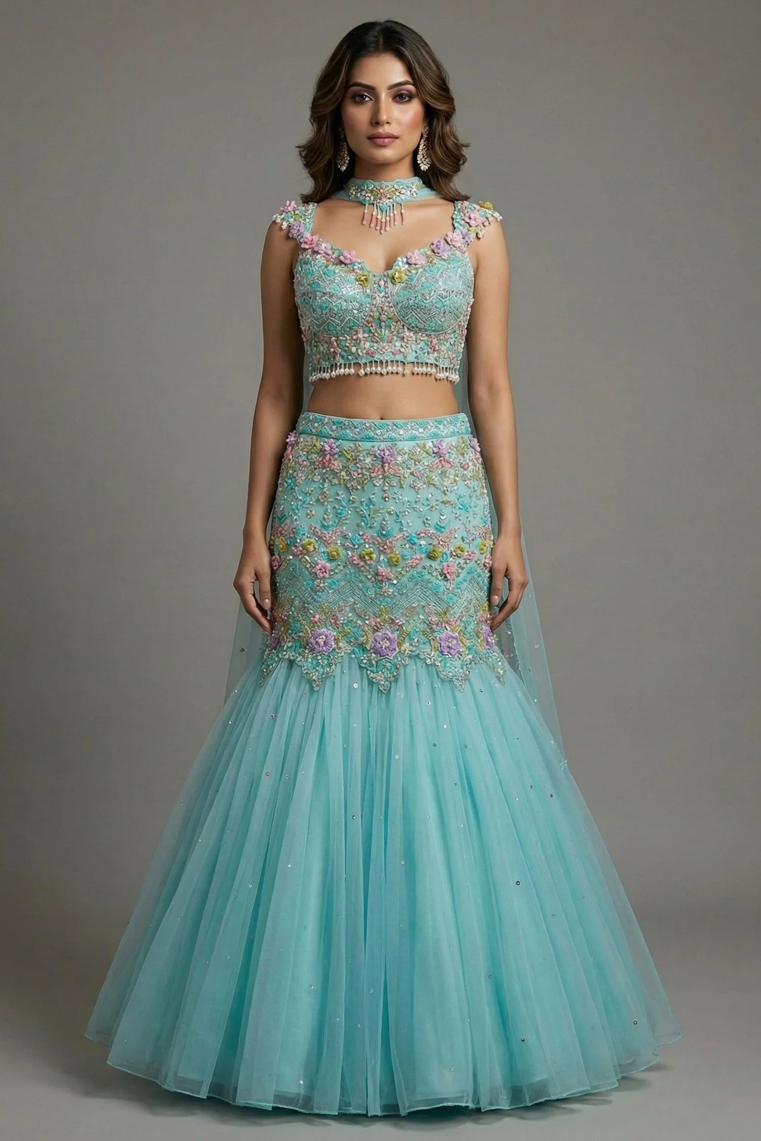 A dreamy mint-blue fish-cut lehenga brought to life with intricate sequins, pearls and 3D floral beadwork in soft pastel tones. The structured bustier blouse features delicate blooms along the neckline and sleeves, adding a whimsical, couture-like charm. Its mermaid silhouette flows into voluminous tulle, creating a graceful blend of shimmer and softness. The handcrafted embellishments elevate the ensemble with a luxurious, fairy-tale aura perfect for spotlight occasions.