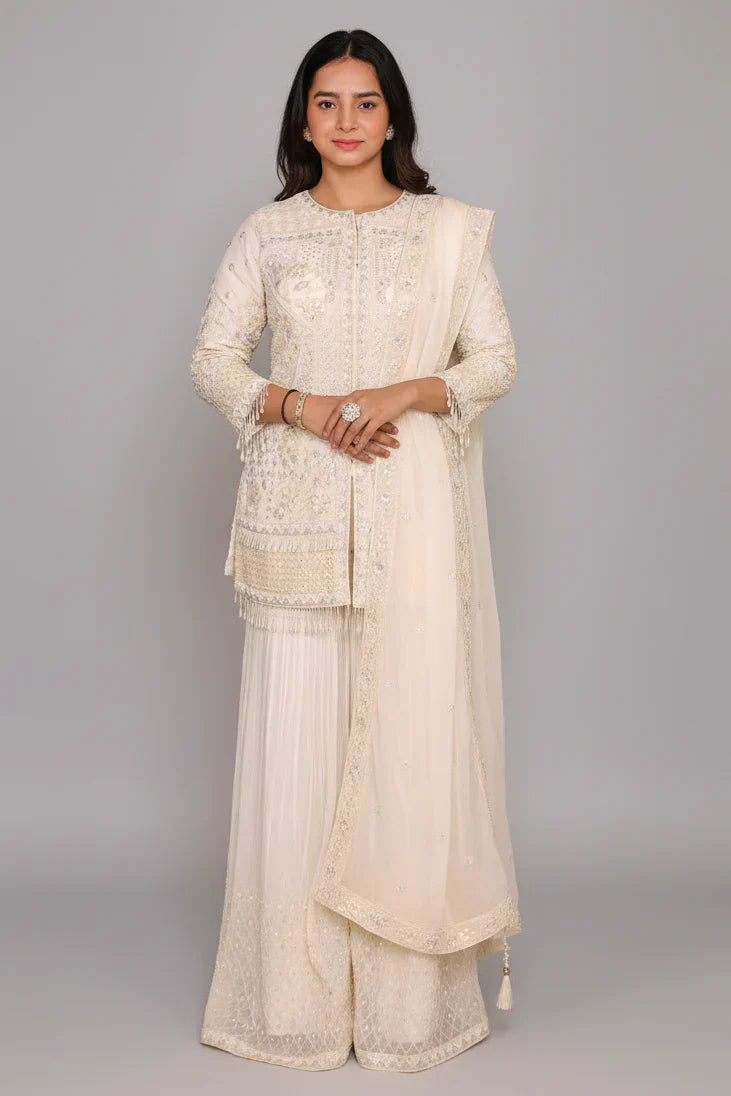 Radiate timeless elegance with this pearl white organza sharara set, crafted to bring soft sophistication to your festive wardrobe. The top features delicate sequin and bead embellishments that add a gentle shimmer without overpowering the look. Paired with a flowy organza sharara and a matching dupatta, this ensemble feels light, graceful, and effortlessly refined. Perfect for engagement ceremonies, festive celebrations, and intimate wedding functions.